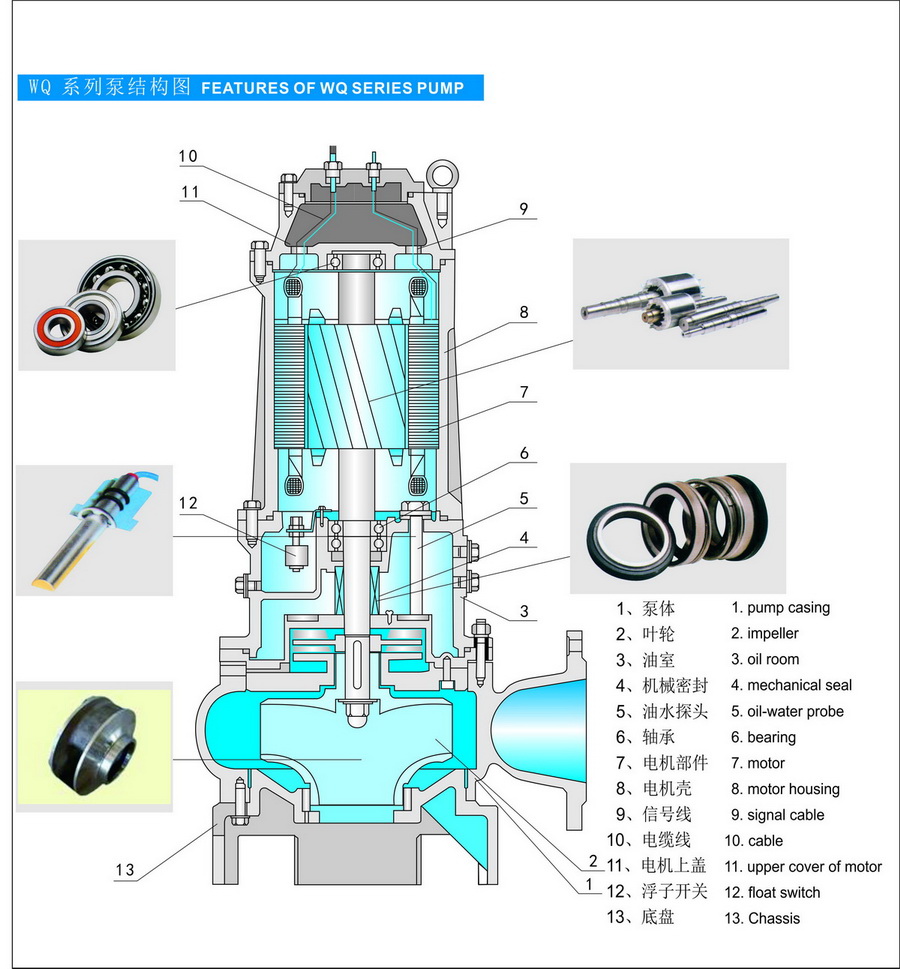 WQP型不銹鋼排污泵由電機(jī)與泵兩部分組成,二者通過油隔離室及機(jī)械密封組件隔幵,屬機(jī)電一體化產(chǎn)品, 電機(jī)與泵合用同一軸(轉(zhuǎn)子)整個(gè)水泵長(zhǎng)度短,結(jié)構(gòu)緊湊。配備多種保護(hù)裝置,使得泵運(yùn)行安全可靠。其主要部件作用如下: