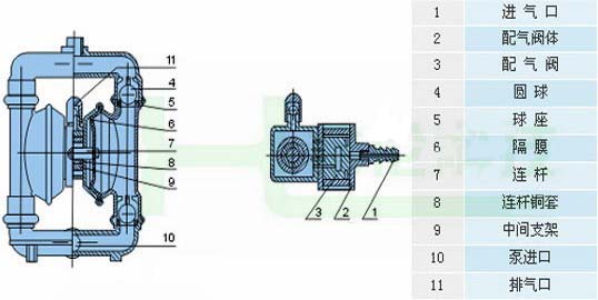 在泵的兩個(gè)對(duì)稱工作腔中,各裝有一塊有彈性的隔膜,聯(lián)桿將兩塊隔膜結(jié)成一體,壓縮空氣從泵的進(jìn)氣頭進(jìn)入配氣閥 后,推動(dòng)兩個(gè)工作腔內(nèi)的隔膜,驅(qū)使聯(lián)桿聯(lián)接的兩塊隔膜同步運(yùn)動(dòng)。與此同時(shí),另一工作腔中的氣體則從隔膜的背后排出泵外。一旦到達(dá)行程終點(diǎn)。配氣機(jī)構(gòu)則自動(dòng)地將壓縮空氣引入另一個(gè)工作腔,推動(dòng)隔膜朝相反方向運(yùn)動(dòng),這樣就形成了兩個(gè)隔膜的同步往復(fù)運(yùn)動(dòng)。每個(gè)工作腔中設(shè)置有兩個(gè)單向球閥,隔膜的往復(fù)運(yùn)動(dòng),造成工作腔內(nèi)容積的改變,迫使兩個(gè)單向球閥交替地開啟和關(guān)閉,從而將液體連續(xù)地吸入和排出。|  |