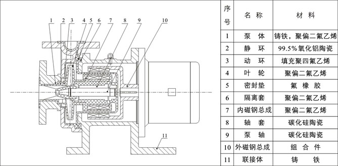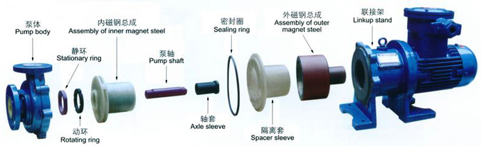 驅(qū)動(dòng)裝置采用主動(dòng)磁鐵聯(lián)軸器直接裝在電機(jī)軸上,泵室完全封閉,通過(guò)磁力偶合間接驅(qū)動(dòng)泵軸上帶磁鐵的葉輪旋轉(zhuǎn)結(jié)構(gòu)緊湊、安全節(jié)能。堅(jiān)固耐用的泵體結(jié)構(gòu)雖然接觸液體部分是氟塑料,但泵外殼是金屬材料,故泵體足以承受管道的重量及抵受機(jī)械性沖擊。氟塑料磁力泵由泵、磁力傳動(dòng)器、電動(dòng)機(jī)三部分組成。關(guān)鍵部件磁力傳動(dòng)器由外磁轉(zhuǎn)子、內(nèi)磁轉(zhuǎn)子及不導(dǎo)磁的隔離套組成。當(dāng)電動(dòng)機(jī)帶動(dòng)外磁轉(zhuǎn)子旋轉(zhuǎn)時(shí),磁場(chǎng)能穿透空氣隙和非磁性物質(zhì),帶動(dòng)與葉輪相連的內(nèi)磁轉(zhuǎn)子作同步旋轉(zhuǎn),實(shí)現(xiàn)動(dòng)力的無(wú)接觸傳遞,將動(dòng)密封轉(zhuǎn)化為靜密封。由于泵軸、內(nèi)磁轉(zhuǎn)子被泵體、隔離套完全封閉,從而徹底解決了“跑、冒、滴、漏”問(wèn)題,消除了煉油化工行業(yè)易燃、易爆、有毒、有害介質(zhì)通過(guò)泵密封泄漏的安全隱患,有力地保證了職工的身心健康和安全生產(chǎn)。